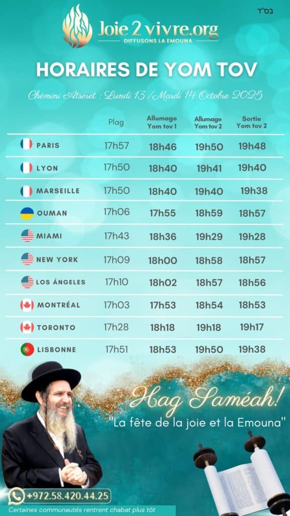 Voici les horaires de Yom Tov pour Jérusalem, Tel Aviv, Ashdod, Netanya, Eilat, Paris, Lyon, Marseille, Ouman, Miami, New-York, Los Angeles, Montréal, Toronto, Lisbonne