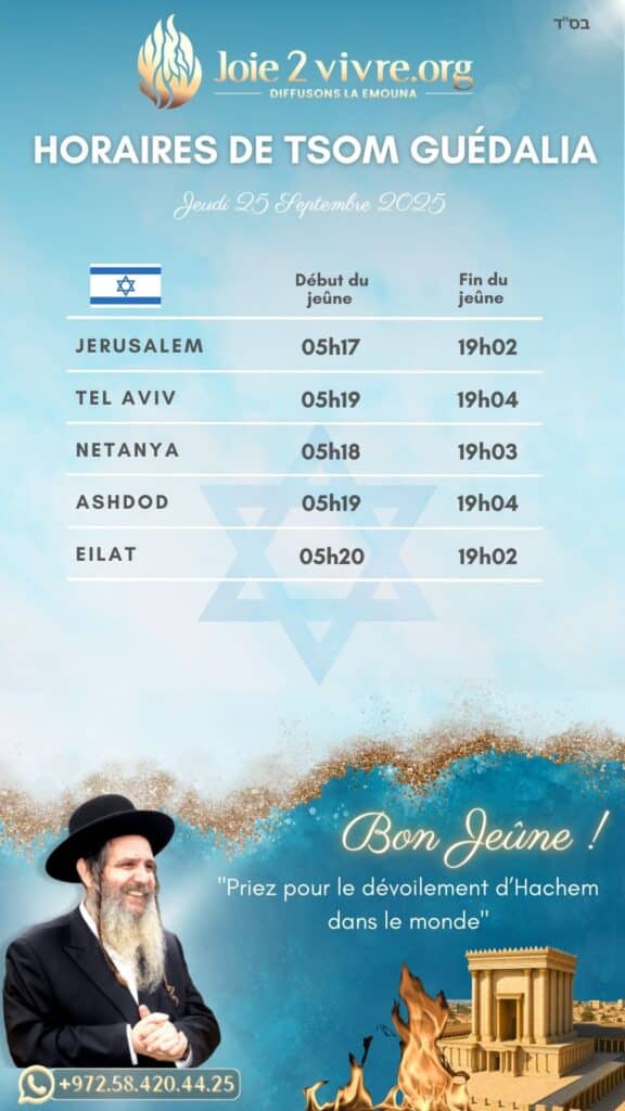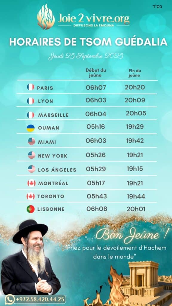 Voici les horaires de Tsom Guédalia pour Jérusalem, Tel Aviv, Ashdod, Netanya, Eilat, Paris, Lyon, Marseille, Ouman, Miami, New-York, Los Angeles, Montréal, Toronto, Lisbonne