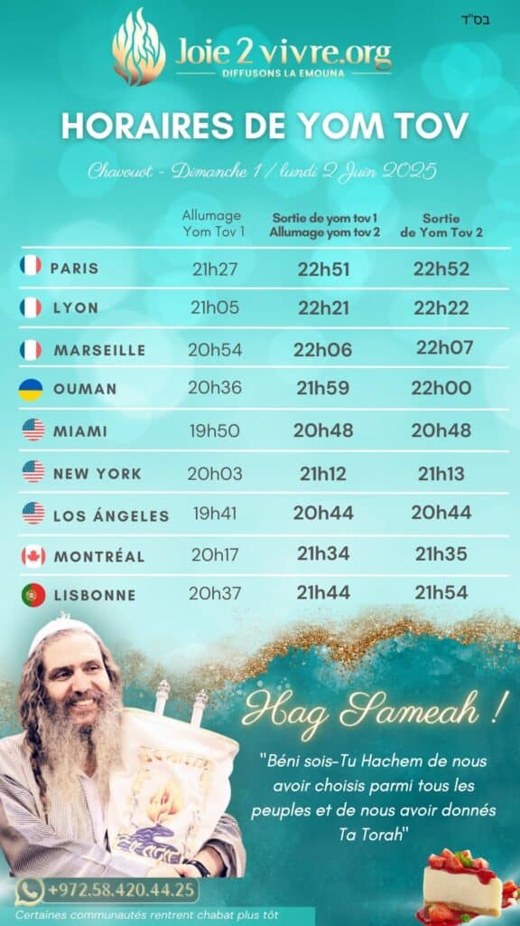 Voici les horaires de Chabbat pour Jérusalem, Tel Aviv, Ashdod, Netanya, Eilat, Paris, Lyon, Marseille, Ouman, Miami, New-York, Los Angeles, Montréal